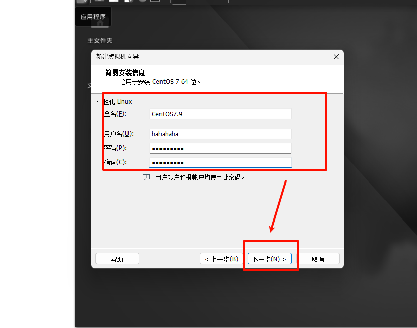 5.给Linux的全名命名“CentOS7.9”在对用户名和密码设置。