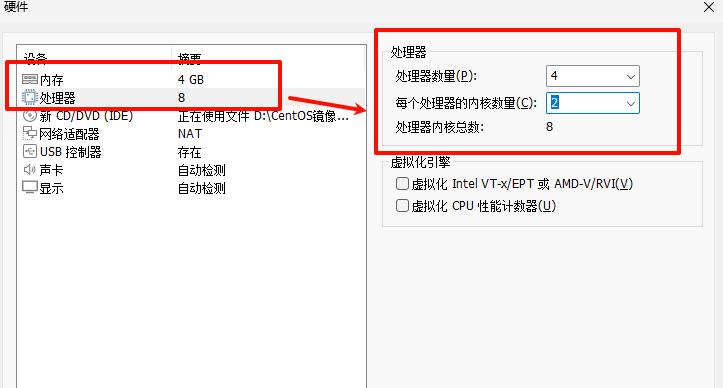 9.分别对“内存”和“处理器”进行设置,内存设置为“4G”和4个处理器和每个处理器的2个内核。