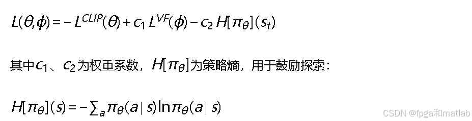 PPO的总损失函数结合策略损失、价值损失和熵正则项: