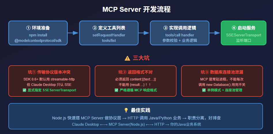 - 最佳实践是HTTP桥接方案:Node.js快速搭MCP Server兼容协议,Java/Python专注业务逻辑