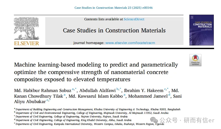 Sobuz, M.H.R., et al. Machine learning-based modeling to predict and parametrically optimize the compressive strength of nanomaterial concrete composites exposed to elevated temperatures. Case Studies in Construction Materials, 2025.