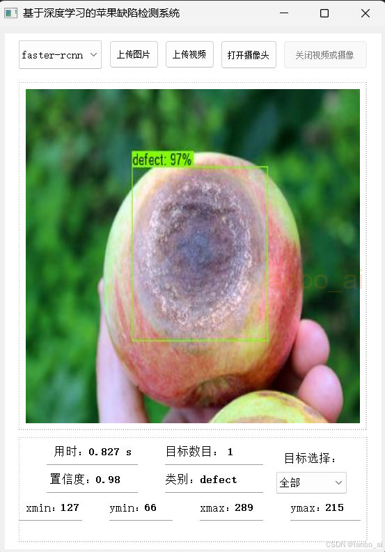 基于yolov8和faster-rcnn的苹果缺陷检测,两个模型合二为一,界面可选择模型,支持图像、视频和摄像实时检测【pytorch框架、python源码】