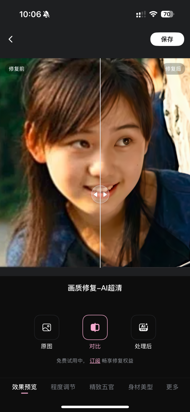 核心亮点:手机端操作极其便捷,下载安装后,打开软件就能上传照片修复,全程只用3秒就能出结果,效率特别高;它专门针对微信、短视频平台压缩后的模糊照片进行优化,修复后的照片不生硬、不失真,能最大程度还原原本的画面细节,不用反复调整参数。