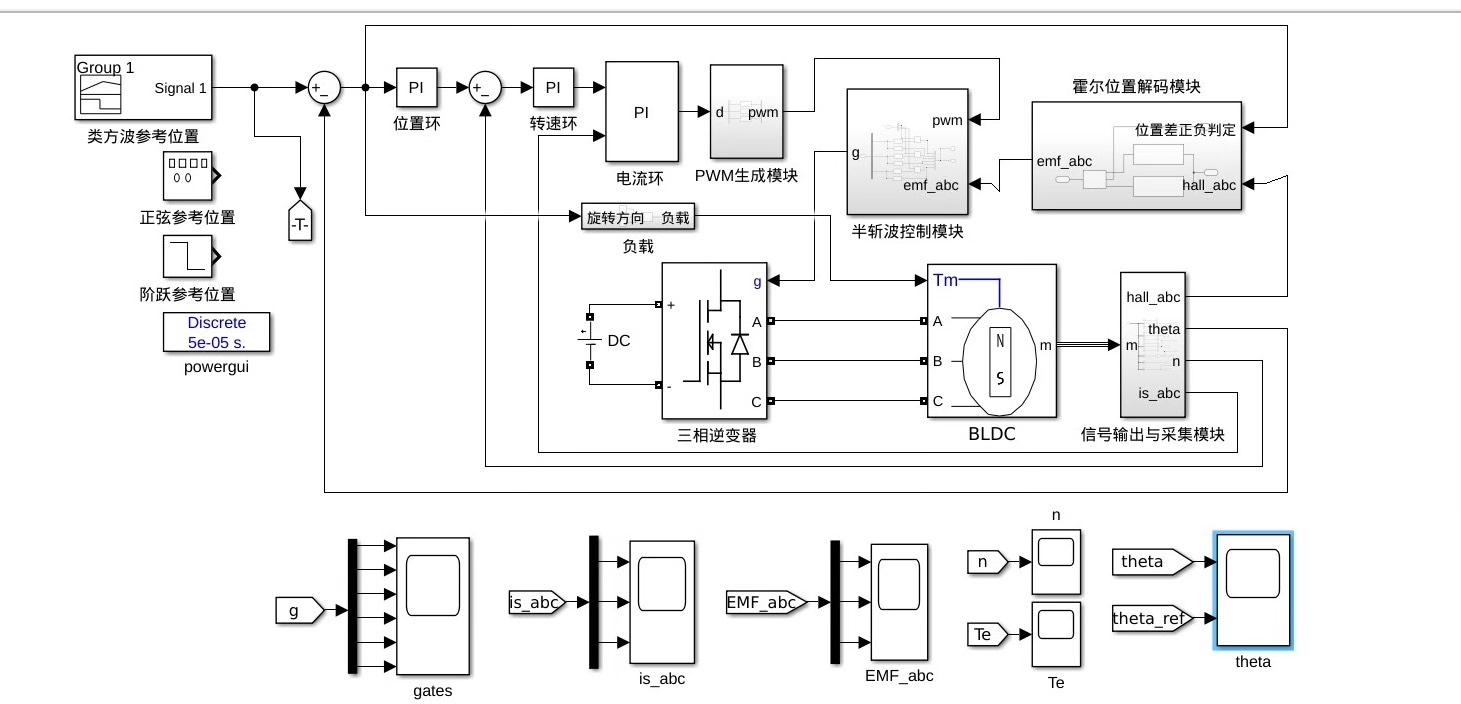 整体框图大致是这样的:从最外层的位置环开始,输入目标位置,与电机反馈的实际位置比较,经过位置 PI 控制器,输出给到速度环作为速度给定。速度环将给定速度和实际速度比较,再经速度 PI 控制器,输出到电流环作为电流给定。电流环则把给定电流和检测到的实际电流比较,经过电流 PI 控制器后,输出控制信号给逆变器模块,逆变器驱动 BLDC 电机运转。电机运转过程中又会反馈实际的位置、速度和电流信号,形成闭环控制。