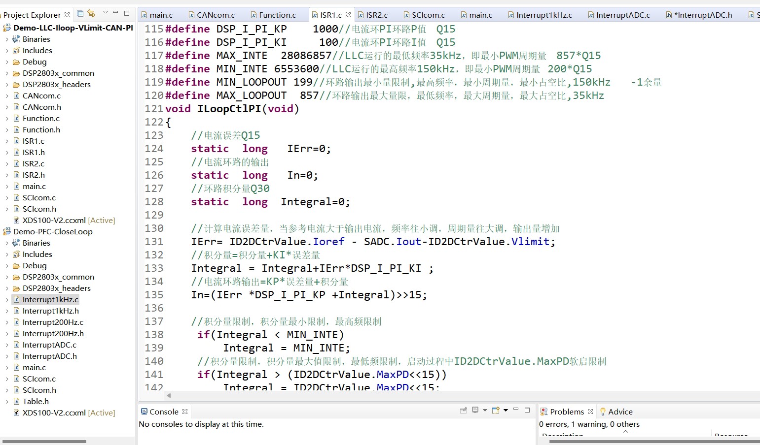 程序部分是基于DSP28034编写的PFC和LLC闭环程序,这里不得不夸一下,注释非常详细。下面给大家展示一段简单的代码示例(仅为示意,非完整代码):