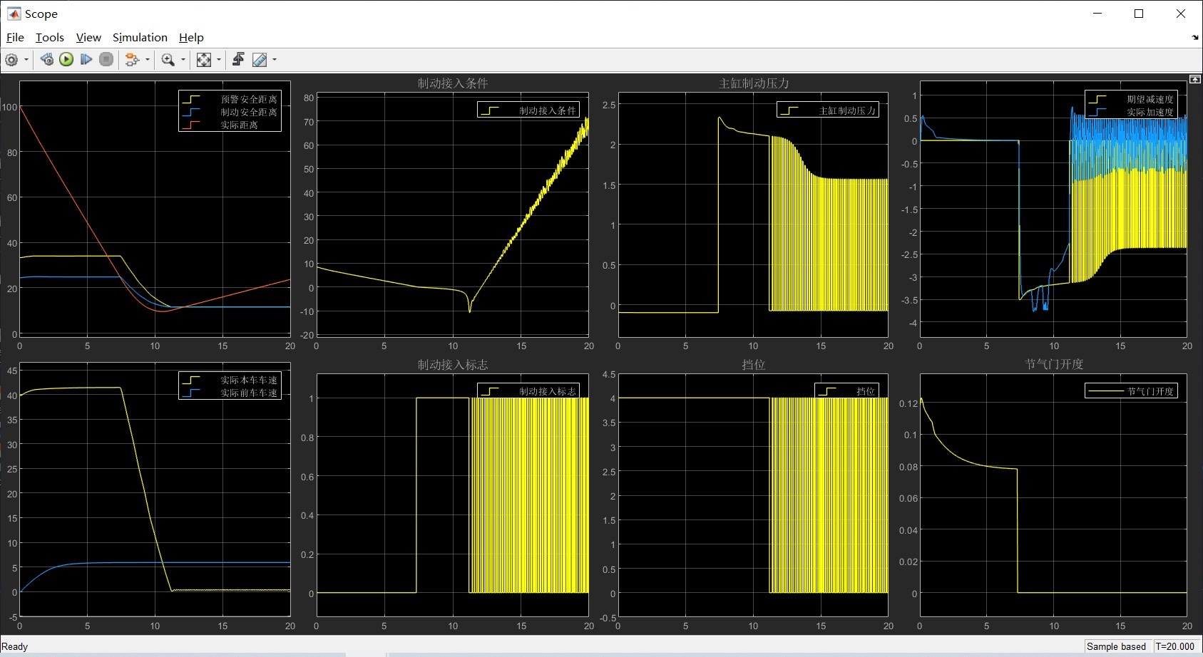 驱动与制动的切换控制是确保车辆安全行驶的关键环节。当不需要制动时,车辆处于驱动状态;而一旦检测到危险,就要迅速切换到制动状态。同时,制动压力与减速度之间存在一定的关系。在Matlab中,我们可以通过条件判断来实现简单的切换逻辑: