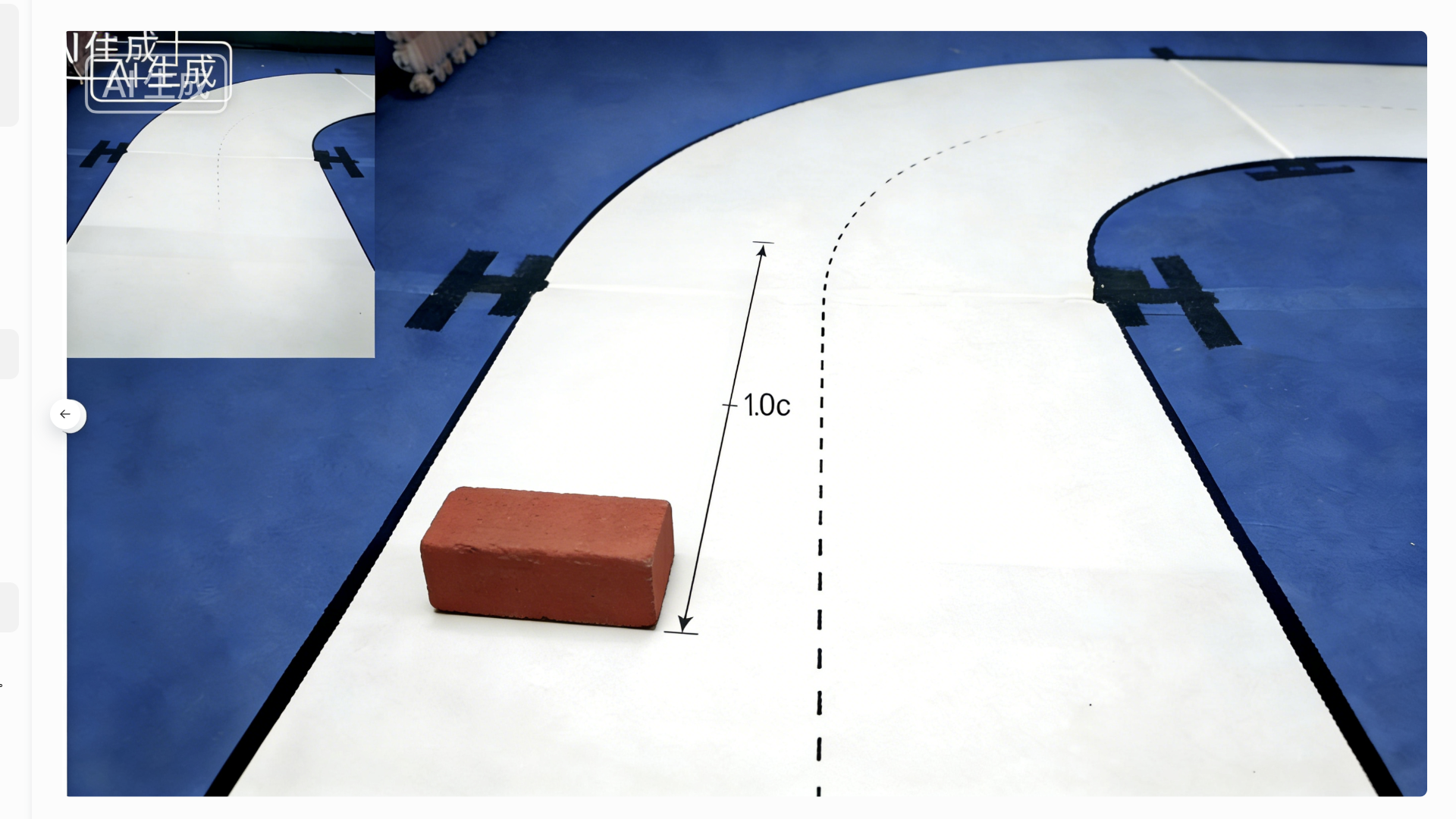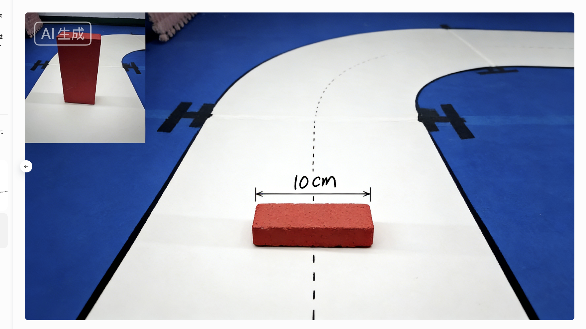首先呢将同学发送照片贴在图片中作为示例, 然后在赛道中间呢绘制一个赛道的大小, 其中包括一个红色的砖块。 以及它的边长距离中心线的10厘米。 下面呢把这个图贴入豆包给出提示词, 提示词是生成一个16:9的图片, 上边有一个白色赛道,背景是蓝色。 其中的红色砖块,距离中心线10厘米。 很可惜,我们看到的确在赛道上有一个砖块, 赛道的颜色和背景都是蓝色,符合要求。 唯独是把砖块放置到赛道中心了, 它其中的10厘米的标识的是砖块的10厘米。 好吧,重新呢在它生成图线上再绘制一个红色的方框, 并且标志出砖块的长边距离赛道中心线是10厘米, 让豆包生成图片。 这一次呢,豆包生成了一个新的图片, 中间包含了两个长方形的砖块, 但是我们看到他把这个砖块放置到赛道的中心上了。 好吧,重新呢给出提示词, 要求把这个砖块往左移动, 距离中心线有10厘米。 可以看到这一次它的确移动了, 仍然是两个砖块啊, 准确讲应该是一个半砖块。 但是它居然是横过来了。 下面还需要进一步对它进行修整。