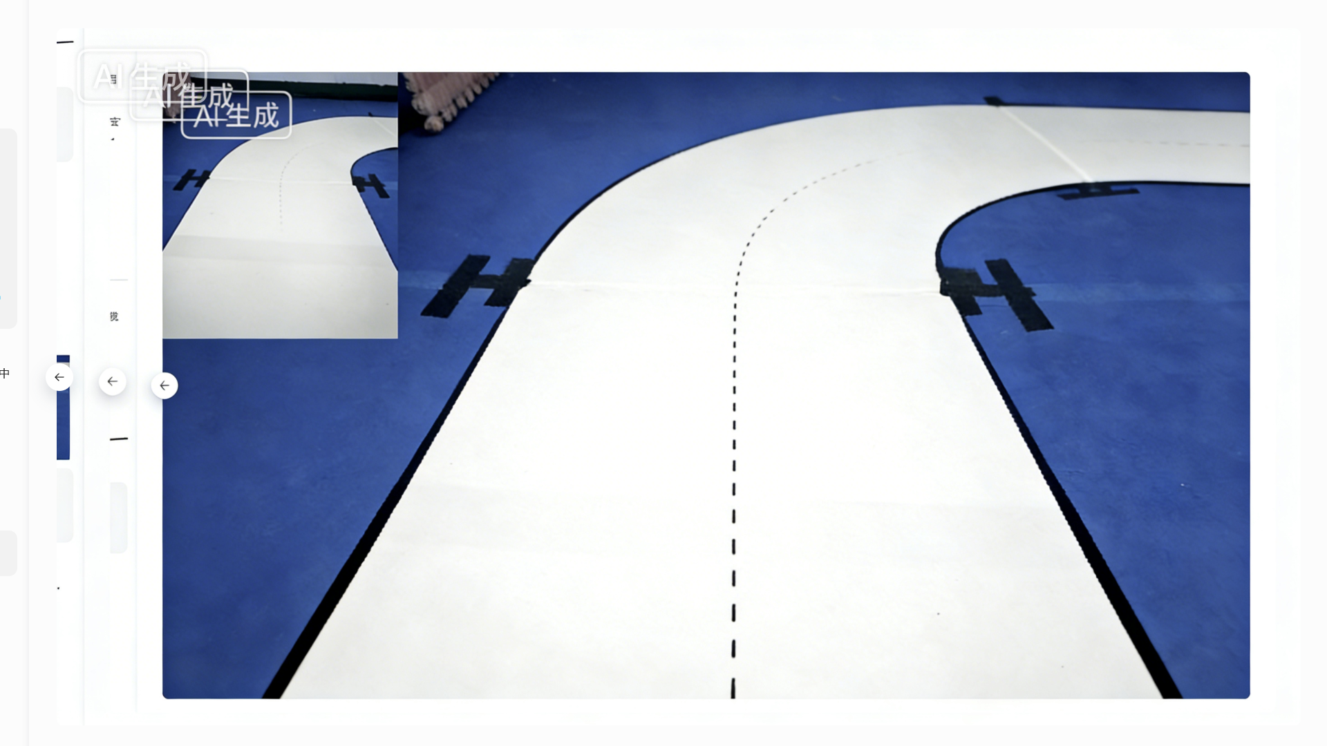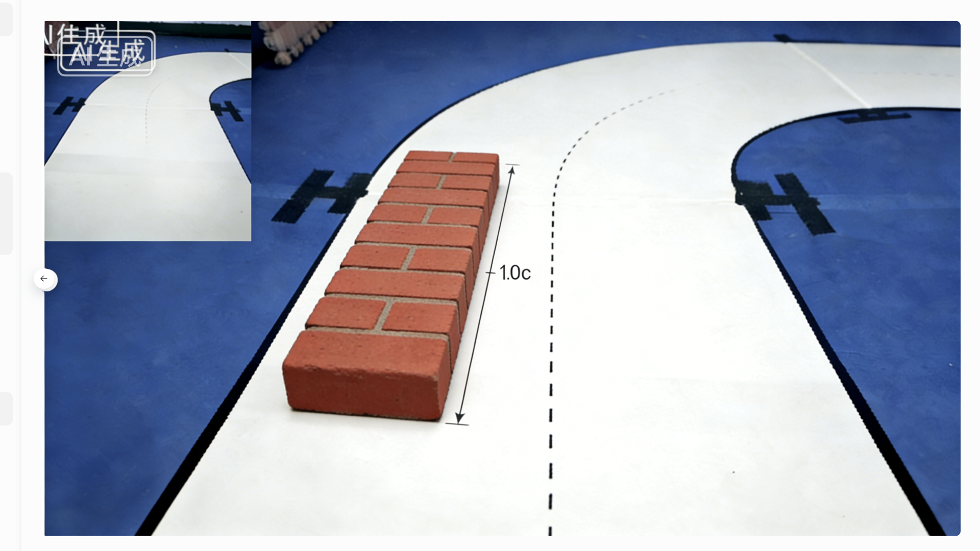 还是从原来的同学发送过来的图开始。 首先手工将图旋转大约45度, 让赛道呈现水平分布的情况, 然后将图贴在豆包里, 通过提示词将图片中的红色砖块去掉。 接下来通过提示词,将图片中棕色的去掉, 只保留蓝色背景, 再通过提示词, 将上述图片水平放置,比例为16:9。 在上述图片中放置一个砖块, 砖块呈现水平分布, 但实际生成的图片中,赛道发生了转变。 接下来就是有意思的过程, 手工将上述赛道中的红色砖块先拷贝下来, 放置在旋转90度之后的赛道上, 通过提示词,让豆包将图片中的赛道表面变得更加光滑连续。 最终得到现在的图片, 只是图片中的赛道表面颜色并不太一致, 然后再手工通过图片编辑软件, 把一些灰色不连续的地方进行平滑。 然后再用手写板板, 在赛道中心线画上虚线, 然后标志出10厘米的距离, 最终得到我们想要的图片。 由此我们得到一个经验,也就是直接通过提示词, 让豆包生成我们想要的图片并不容易, 那在这里呢我们一般用了提示词, 一半呢将中间生成的图片进行切割、组装,最后得到想要的图片了。