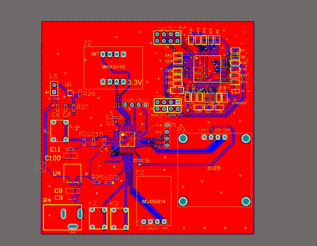 基于stm32人体健康监测系统,包含pcb (心率,血氧,体温,语音播报,报警) 本设计采用STM32F103C8T6作为主控 使用MAX30102采集心率和血氧值 使用MLX90614测量体温 OLED显示当前信息 语音播报使用SYN6658芯片,外围自己搭建,播放当前温度、心率、血氧 两个按键一个蜂鸣器警报,当体温、心率、血氧异常发出警报 资料包括源码,原理图,pcb,bom清单,都是原始文件