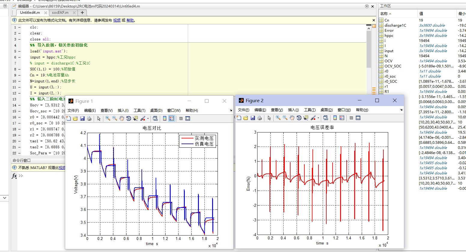 作为代码的核心计算模块,该模块基于二阶RC等效电路原理,结合前面模块提供的参数与函数模型,逐步计算电池在每个时间步长下的端电压与SOC变化,同时统计电压误差率。