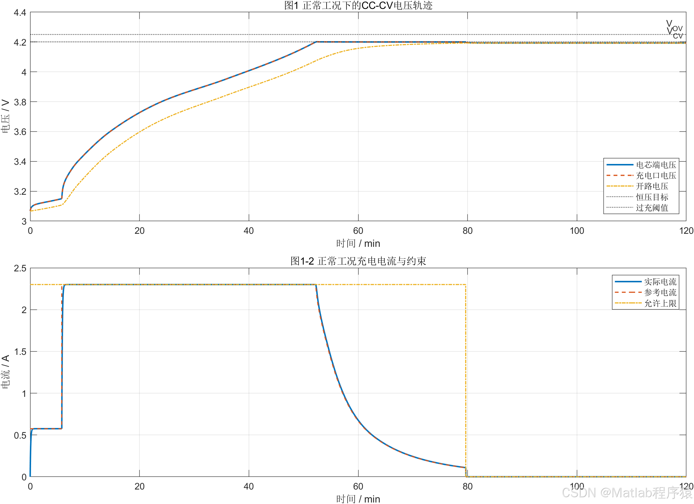 本文进一步对阶段切换逻辑进行了工程化处理,尤其强调充电口电压而非单纯电芯电压在控制中的作用。对于正常工况,充电口与电芯电压差异较小,二者几乎同步变化;但在接触不良或附加连接电阻存在时,外部充电口电压会因额外压降提前抬升。如果仍以电芯电压作为CC转CV判据,容易导致口电压已越近上限而系统仍维持较大电流,从而使故障工况下的控制行为与实际充电器不一致。基于这一考虑,本文在模型中将电芯端电压与充电口电压明确分离,并以前者反映电芯内部状态、以后者作为外部充电控制与端口诊断的重要依据。该处理方式使故障工况下的控制行为更符合工程实际,也使接触不良诊断具有了明确的物理基础。