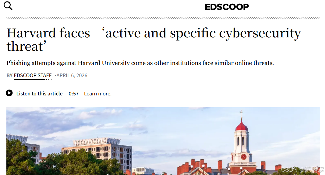 2026 年 4 月 6 日,EdScoop 援引《哈佛深红报》报道,哈佛大学面临主动且特定的网络安全威胁:攻击者伪造校方 IT 人员身份,搭建视觉与功能高度仿真的虚假登录页面,定向诱骗师生输入账号密码,企图入侵校内核心网络;同期宾夕法尼亚大学安嫩伯格学院等高校遭遇同类社会工程学攻击,形成针对高等教育机构的集中攻击浪潮。哈佛首席信息安全与数据隐私官 Michael Tran Duff 向校内发出预警,提示师生勿与自称 “哈佛 IT” 的人员交互,保持高度警惕。