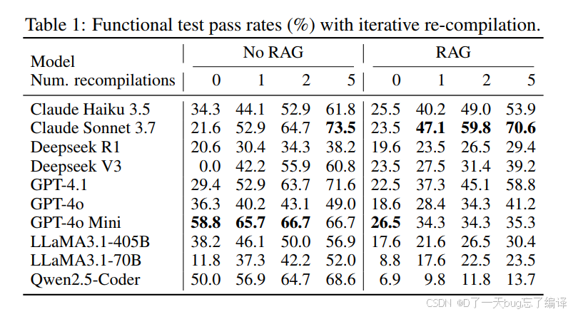 Table 1 给了不同模型在不同重编译轮次下的 pass rate,并区分了 NoRAG 和 RAG 两种设置。