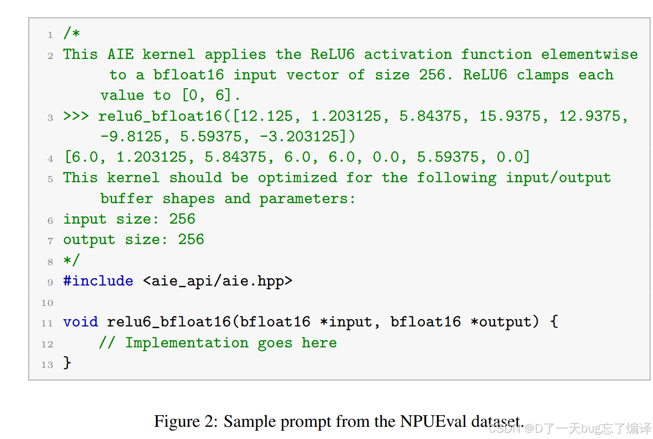 图 2 展示了一个示例 prompt,比如 relu6_bfloat16 这样的 kernel,除了功能说明外,还会给出输入输出大小。