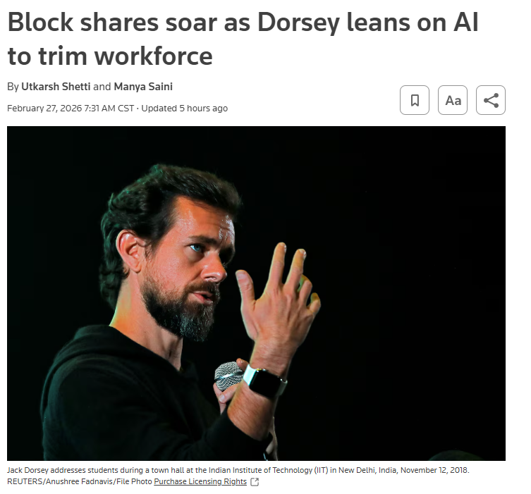 2月26日,美国金融科技公司Block宣布,裁员40%。砍掉4000人。是业绩不好吗?不是。他们刚发完财报,毛利同比增长超过20%。业绩好得很。那为什么?因为AI太好用,好用到不需要这么多人。与其未来被逼着削减成本,公司更愿意提前转型。