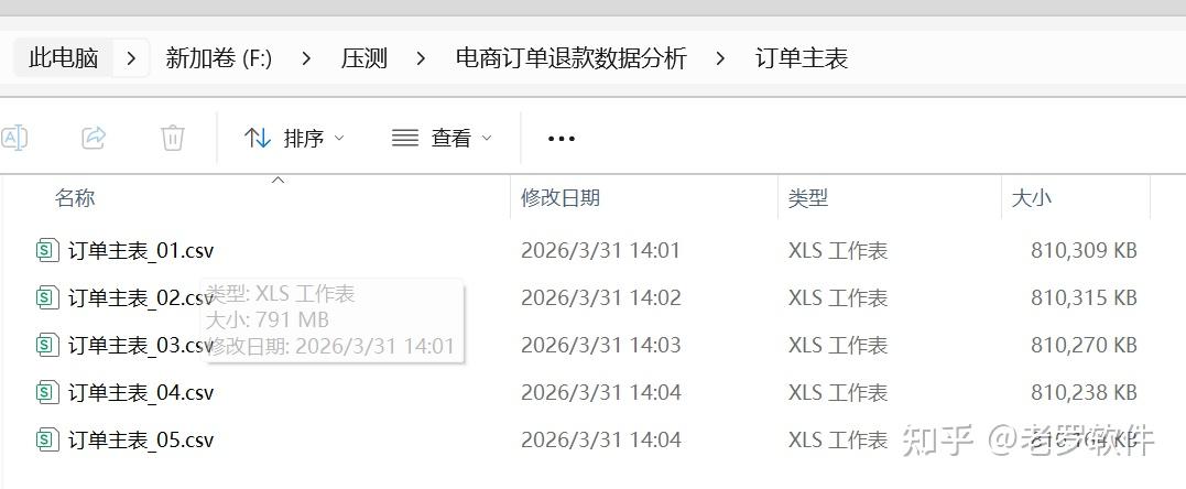 有一批子表 “订单表” ,位置在“F:\压测\电商订单退款数据分析\订单主表” , 如图: