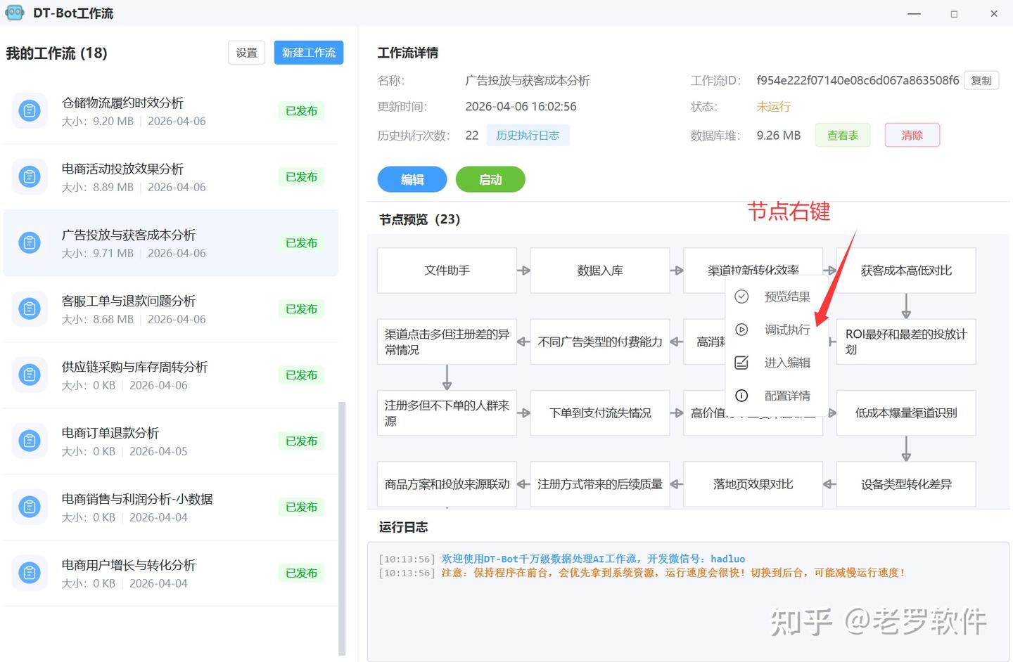 支持节点调试功能,您可以在任何一个节点进行运行,而不必每次都整个工作流执行,在节点右键即可执行调试。如图: