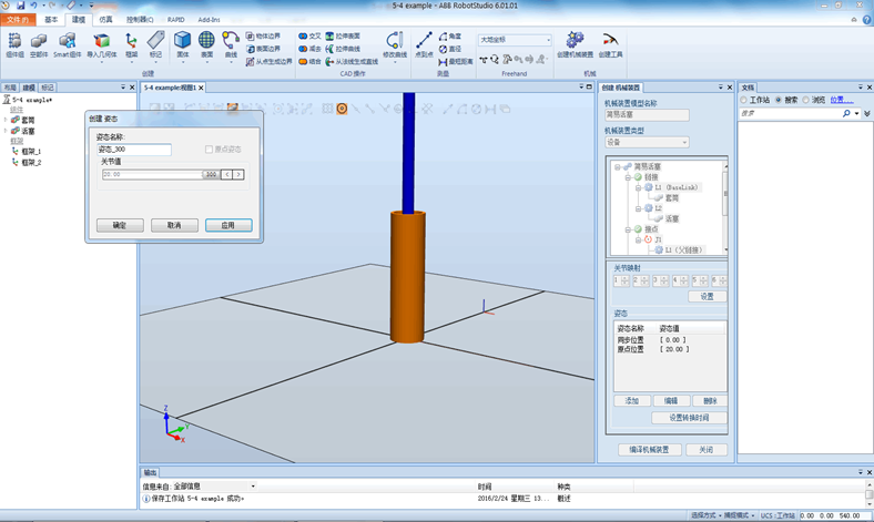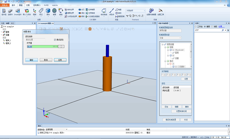 单击“创建机械装置”中的“编译机械装置”,单击右下方“添加”,设置姿态1的关节值:20,同时勾选原点位置,然后单击“应用”.