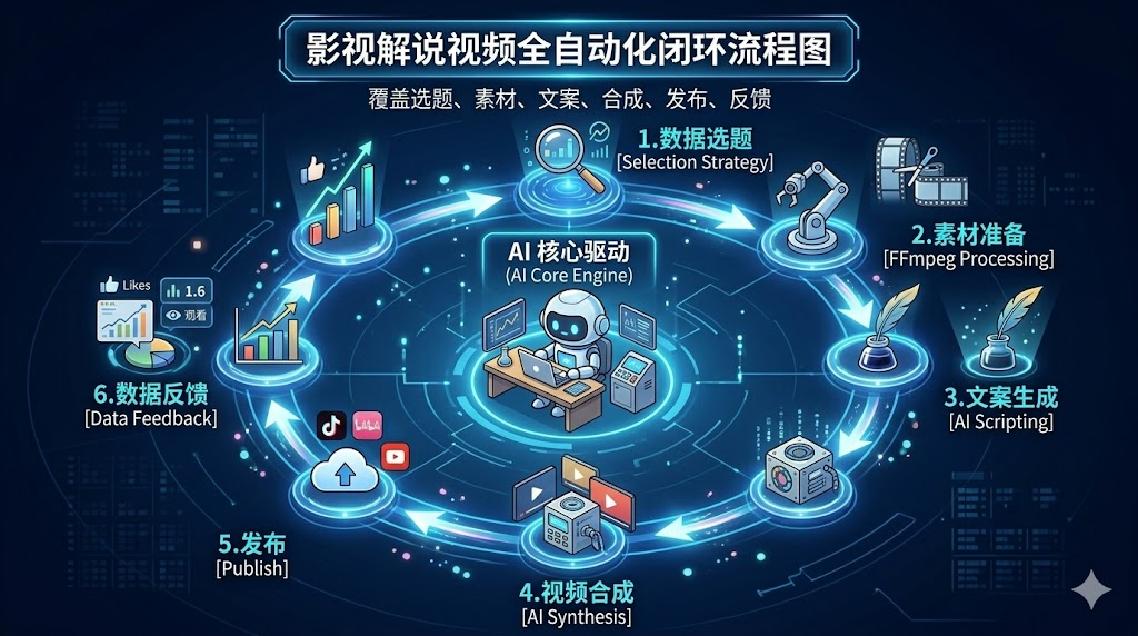 覆盖豆瓣数据监控、FFmpeg 素材处理、Prompt 文案生成、CLI 一键合成、平台数据反馈五个环节。