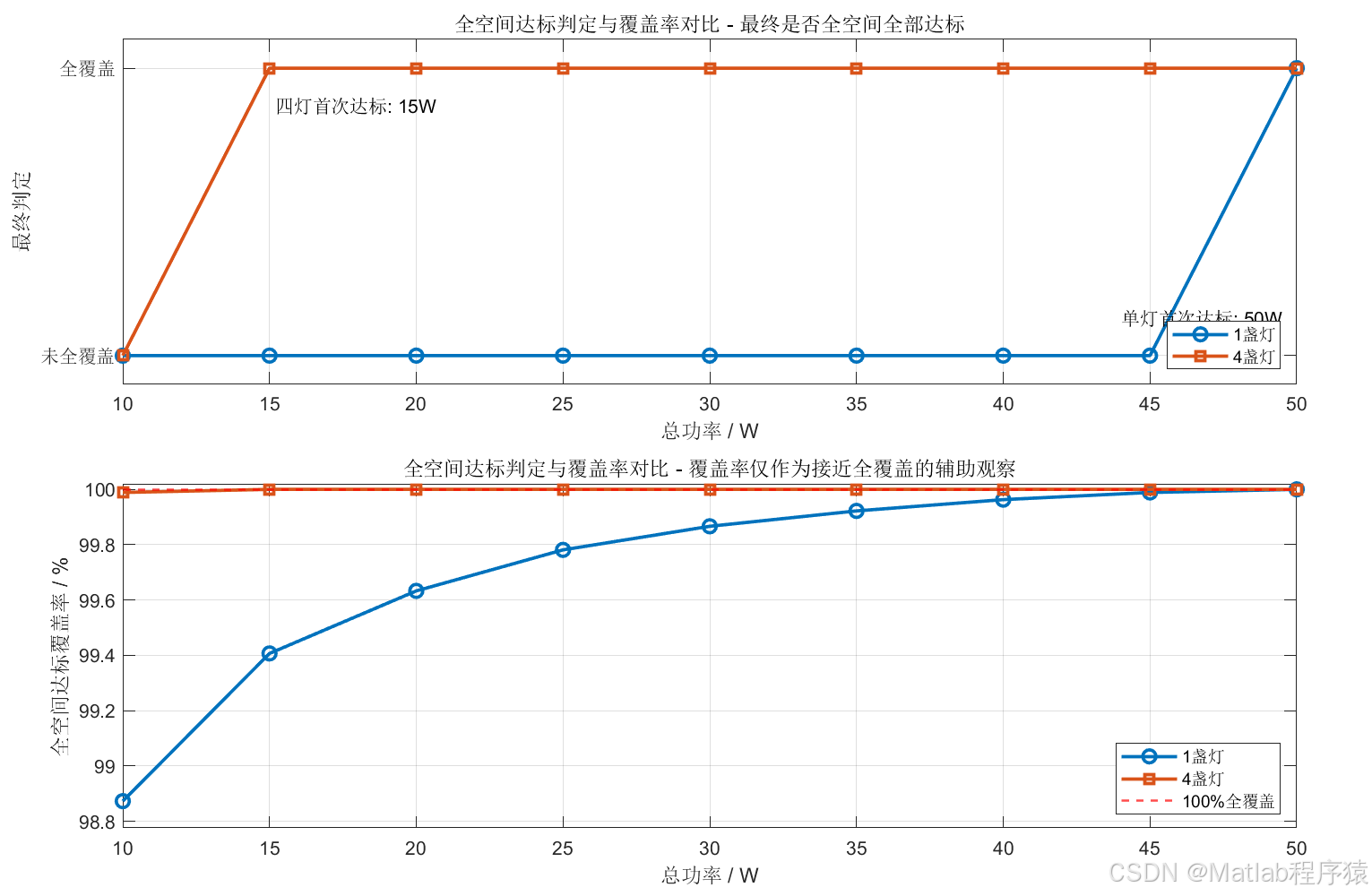 在仿真设计中,功率变量设置为10 W至50 W的离散扫描序列,步长为5 W。对于单灯方案,总功率全部由一盏灯承担;对于四灯方案,总功率由四盏灯平均分配,以保证两类方案在比较时具有一致的总功率基准。这样设置的目的在于回答两个核心问题:其一,在固定场景和固定指标约束下,单灯方案与多灯方案各自在何种总功率条件下能够首次实现全空间全部达标;其二,在总功率相同的前提下,多灯分布式布局是否比单灯集中式布局具有更高的空间覆盖效率。