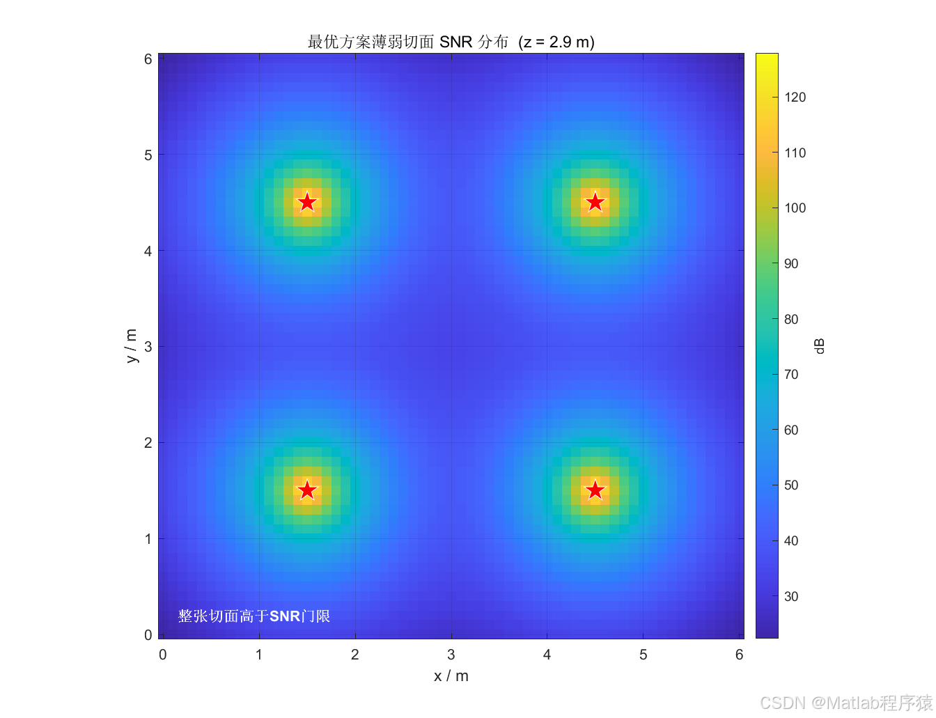 在空间扫描方面,本文采用三维离散评估方式,对房间内部有效接收空间进行逐点分析。考虑到实际接收端不可能与地面、墙面或天花板完全重合,本文将室内边界内侧的可用空间作为评价对象,从而避免边界几何退化点引入非物理结果。对每个离散点,分别判断其是否满足SNR、BER和速率三项门限,并在此基础上统计方案在全空间范围内是否实现全部达标。同时,为更直观地展示系统空间分布规律,本文还针对最优方案自动提取最薄弱水平切面,对该切面上的SNR分布、BER分布与速率分布进行分析,以便识别系统中最不利位置和裕量分布特征。