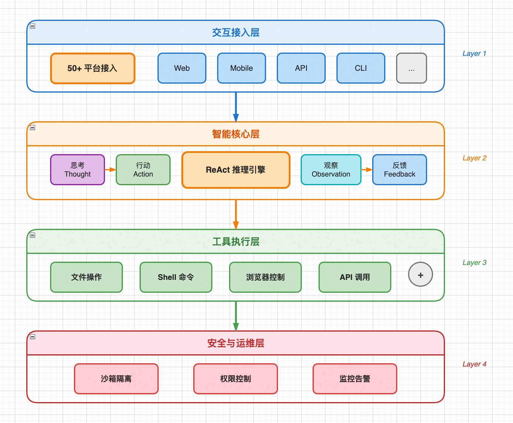 OpenClaw 的设计围绕"连接"展开。一层交互接入(50+平台),一层 ReAct 推理核心,一层工具执行,一层安全沙箱。一个 Gateway 管所有渠道,技能从 ClawHub 下载现成的。
