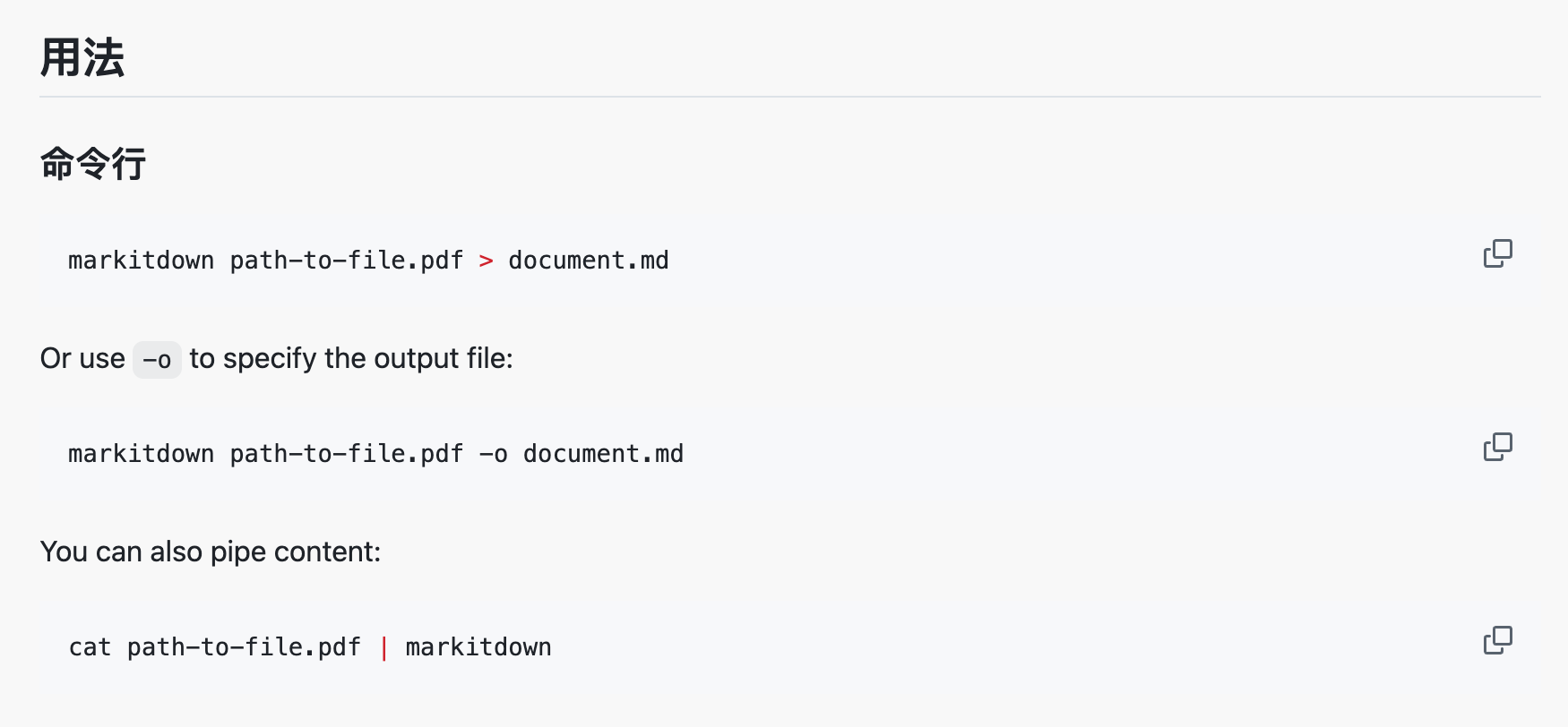 它还提供了 MCP Server,可以直接接入到 AI 编程工具中。之后你在项目里丢一个 PDF 或 Word 文件让 AI 分析,它就会自动调用 MarkItDown 先转成 Markdown 再处理。