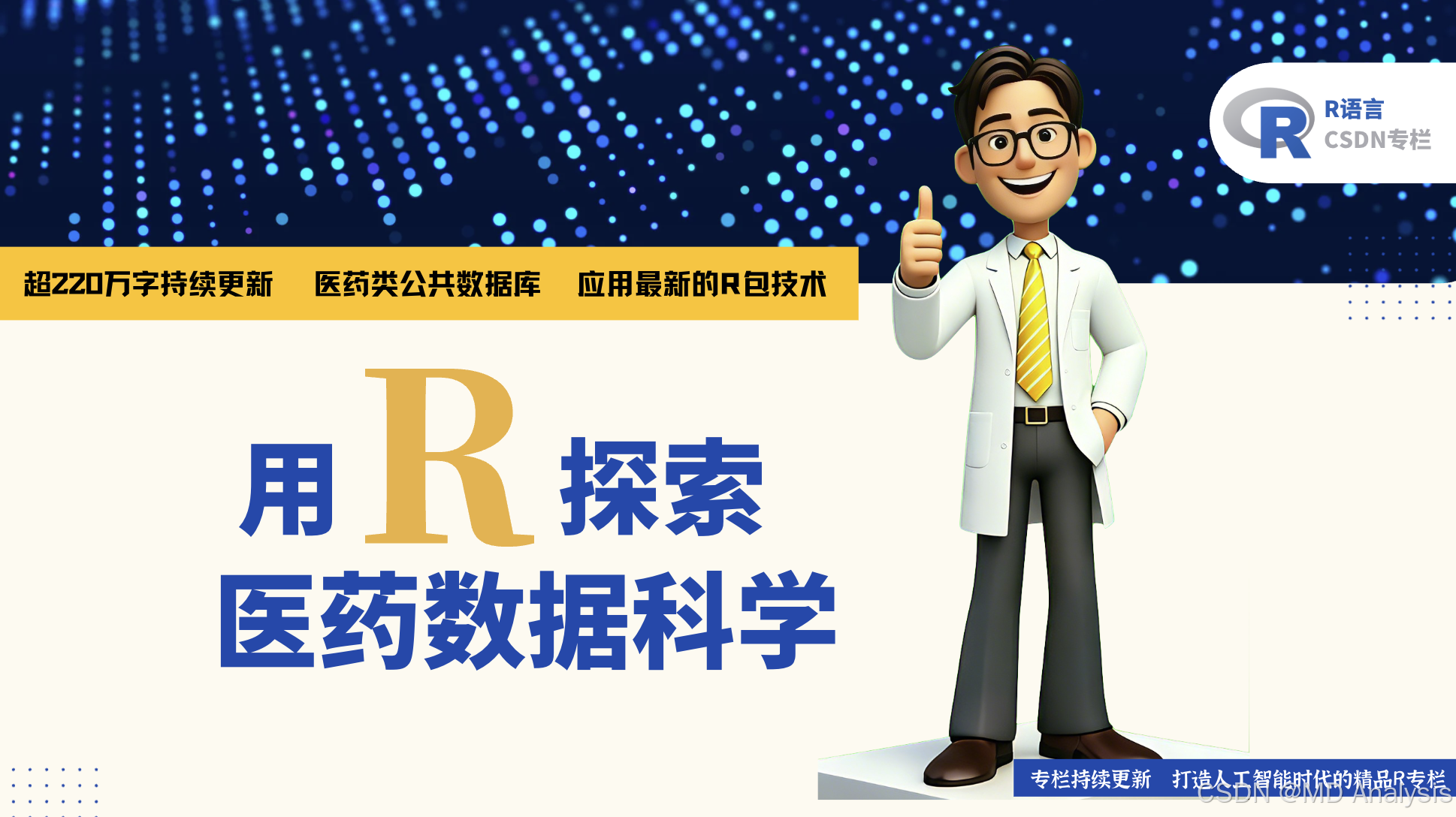 市面上的 R 语言培训班和书籍(包括网络上的文章或视频),由于受限于培训时间或书籍篇幅,往往难以深入探讨 R 语言在数据科学或人工智能中的具体应用场景,内容泛泛而谈,最终无法真正解决实际工作中的问题。同时,它们也缺乏针对医药领域的深度结合与讨论。为了解决这些痛点,我们推出了《用 R 探索医药数据科学》专栏。该专栏将持续更新,不仅为您提供系统化的学习内容,更致力于成为您掌握最新、最全医药数据科学技术的得力助手。