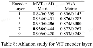 - 表格 8 显示,浅层和深层均不适合无监督异常检测,中间层(如第 5 层)因同时包含上下文和语义信息而表现最佳。