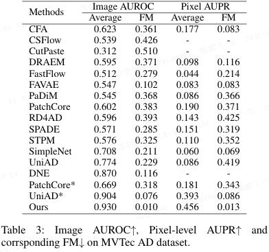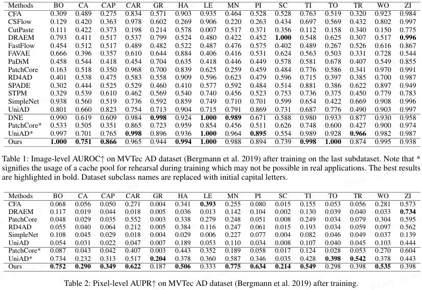 对比方法:包括 CFA、CSFlow、CutPaste、DNE、DRAEM、FastFlow、FAVAE、PaDiM、PatchCore、RD4AD、SPADE、STPM、SimpleNet、UniAD 等。其中 DNE 是 SOTA 无监督持续 AD 方法。本文还对 PatchCore 和 UniAD 进行了基于重演(replay)的实验,为其提供可存储 100 个训练样本的缓存池。