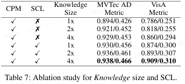 - CPM 学习 “键-提示-知识” 记忆空间,存储自动选择的任务查询、任务适配提示以及不同类别的 “正常” 知识。给定图像,自动选择键以检索对应任务提示,进而提取图像特征并与正常知识比较进行异常检测。