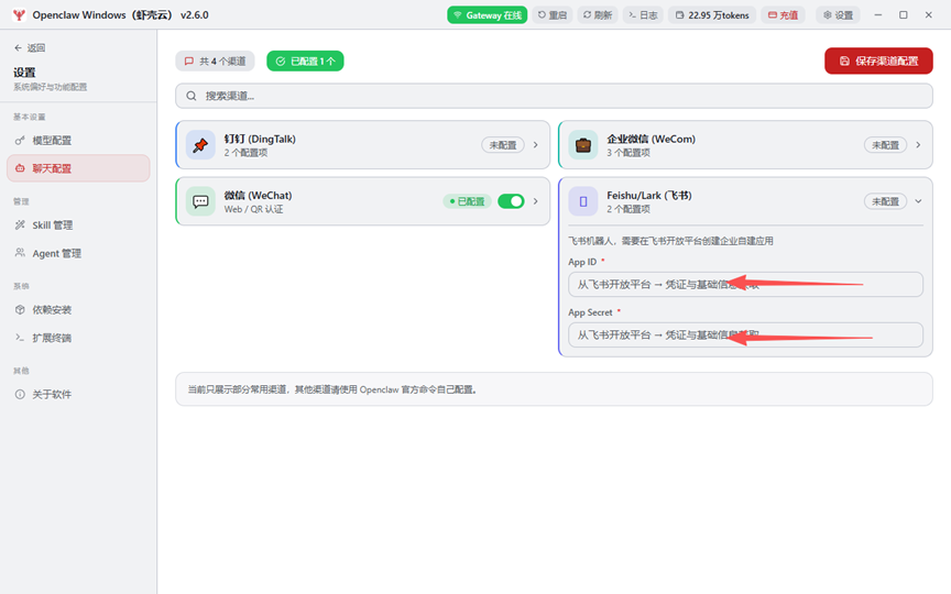 获取飞书的应用凭证后,接下来在OpenClaw平台完成最终的绑定操作。