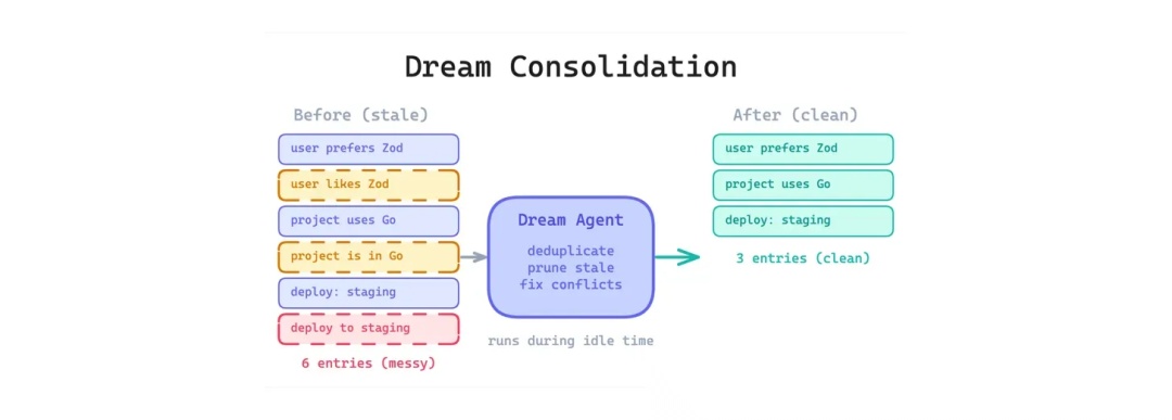 这个模式的思路是加一个后台整理机制,在空闲时定期做清理:去重、删旧、重组结构,让记忆保持干净、可用。可以理解为给 Agent 做一次「垃圾回收」。