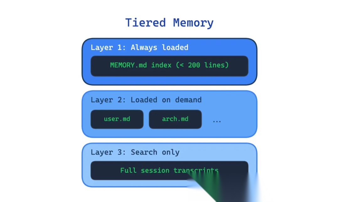 这个模式的做法是把记忆分层:一个精简的索引始终放在上下文里(比如控制在几百行以内),和当前任务相关的内容按需加载,完整的历史记录则留在磁盘上,需要时再去查。