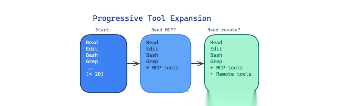这个模式的做法是先给一小部分常用工具,够用就行;其他工具按需再打开。比如读写文件、搜索这些作为默认能力,复杂一点的工具等用到再加载。