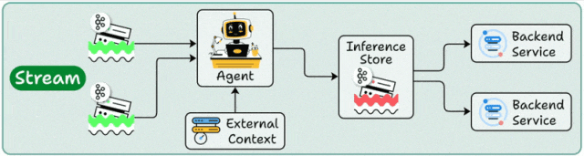 它会持续处理系统中实时流动的数据 —— AI 智能体始终处于活跃状态,可同时处理多个并发数据流,还能根据需要访问流存储和后端服务。