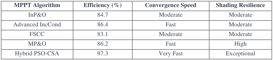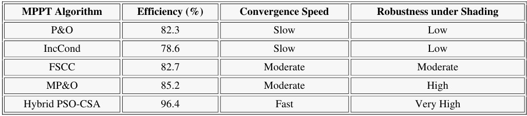 • PSO-CSA混合:全局-局部搜索分层优化,阴影鲁棒性评级"卓越" 。