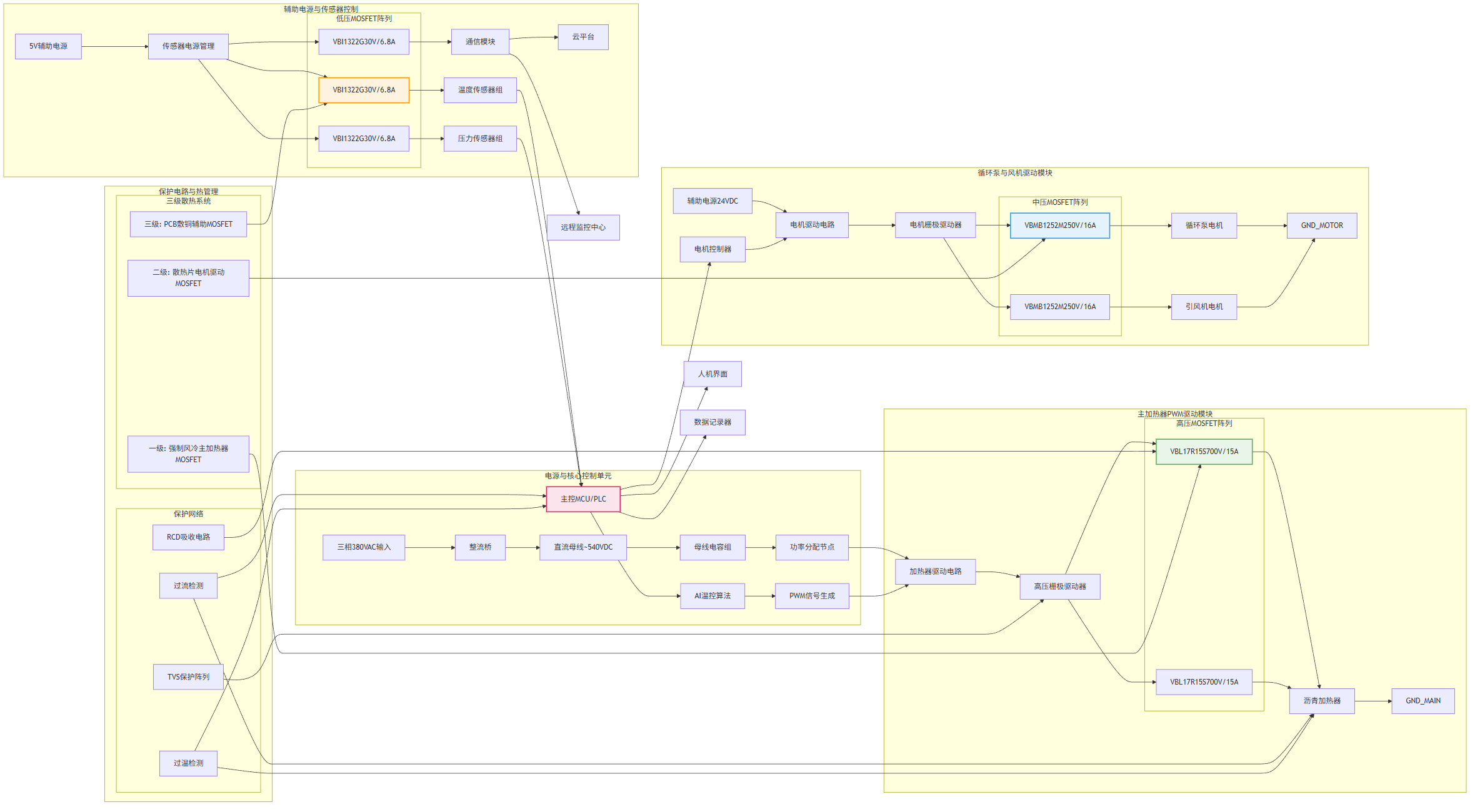 图2: AI沥青生产温度控制系统方案与适用功率器件型号分析推荐VBI1322G与VBMB1252M与VBP165R11S与VBL17R15S与产品应用拓扑图_02_heater