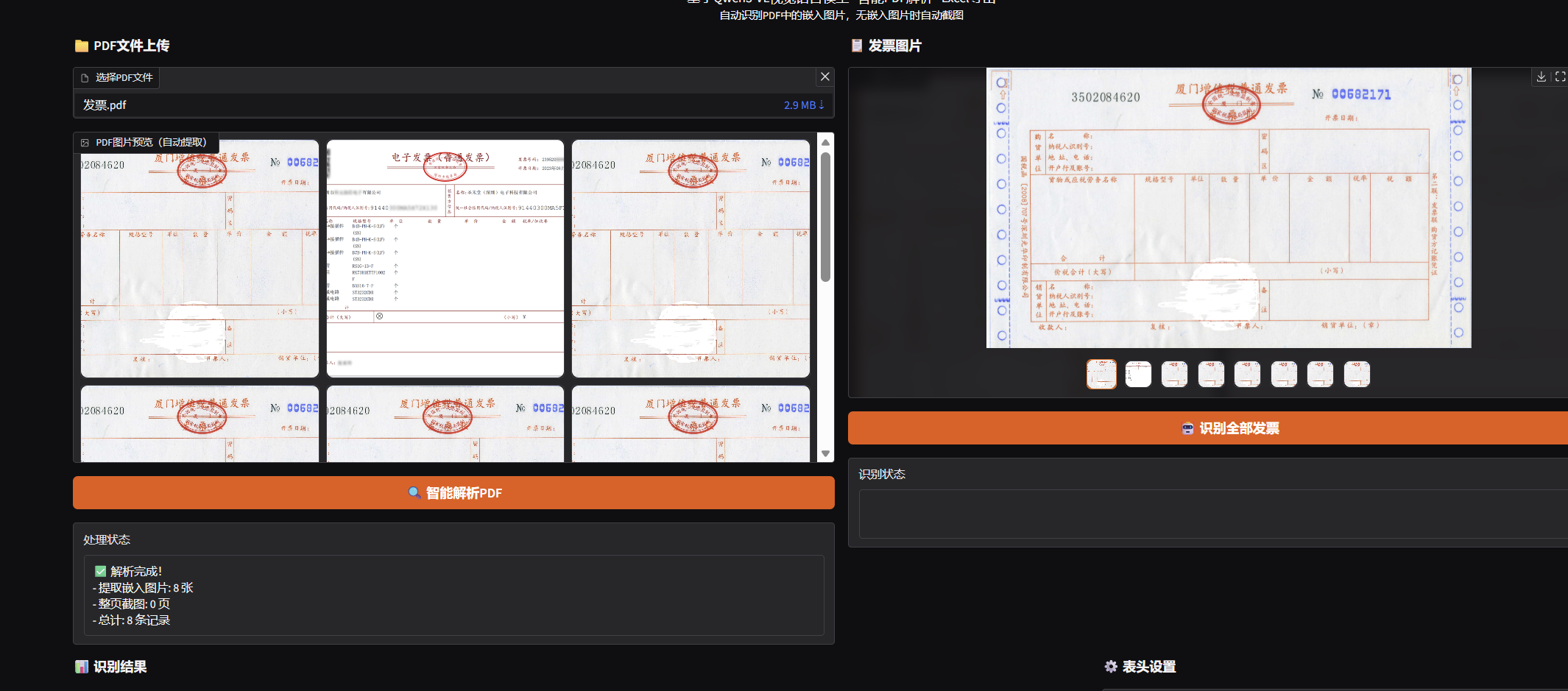 这里好多未识别是因为我用的两张发票都是网上找的,很多都是马赛克,所有没有识别到。表头也可以自定义填写。有需要的财务朋友可以试试,可以大大节省人力。