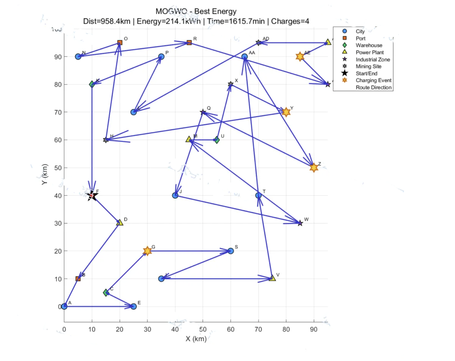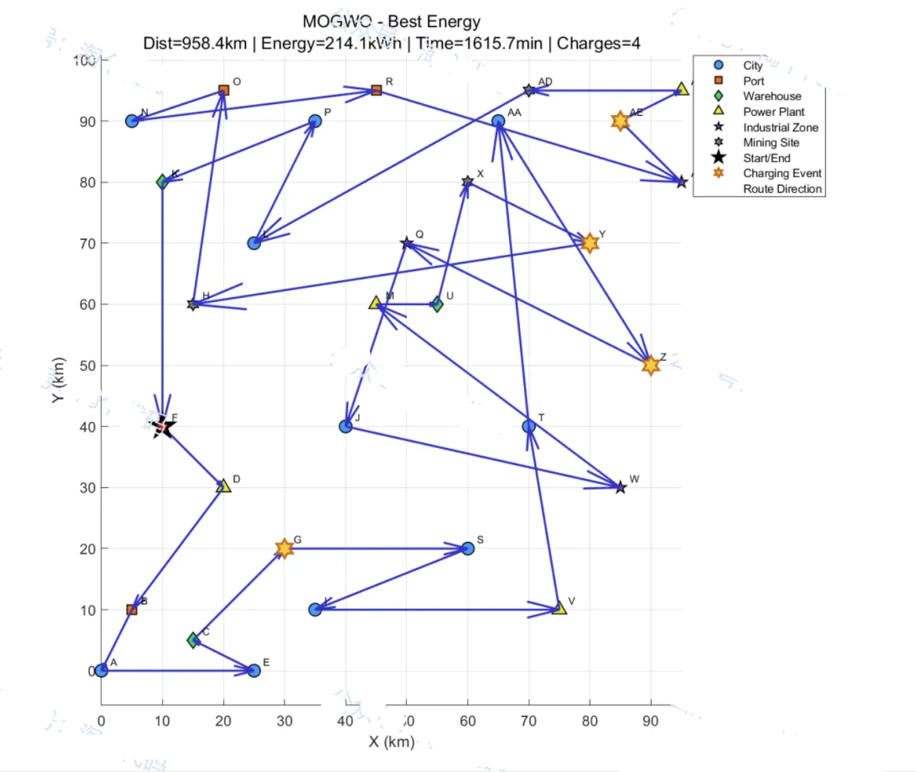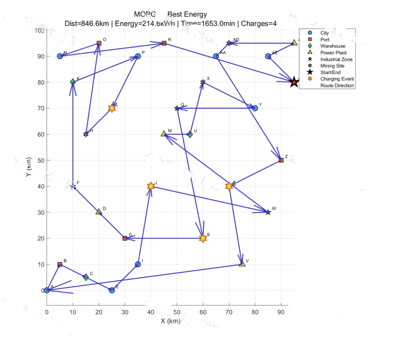 - 建立了包含总距离、总能耗、总耗时的三目标优化模型,嵌入电池容量、电量阈值、充电站分布等多重现实约束;