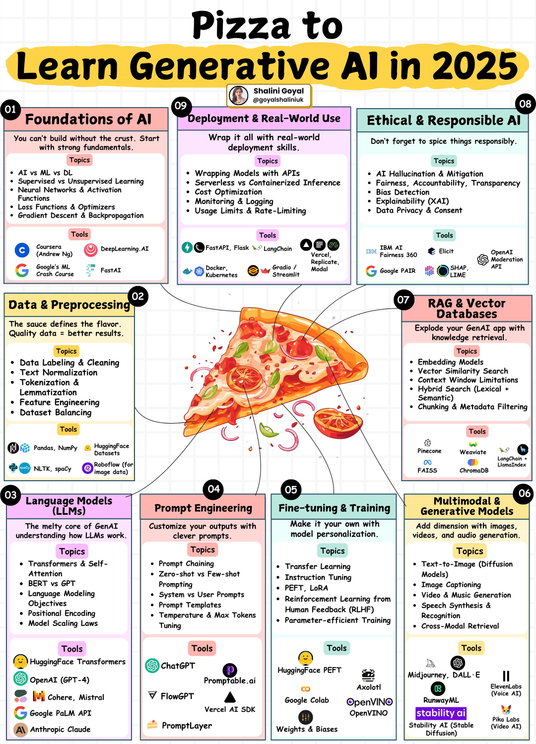 为任何人创建了一份在人工智能、机器学习和生成式人工智能领域取得成功的完整路线图。这份指南概述了每个AI专业人士都应该学习的10个关键领域的核心技术、工具和框架: