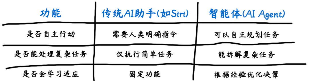 - 智能体则更像一位项目经理,当你下达一个目标,它便会全权负责:自主地制定计划、调兵遣将(调用工具)、推进项目,并克服困难直至交付最终成果。