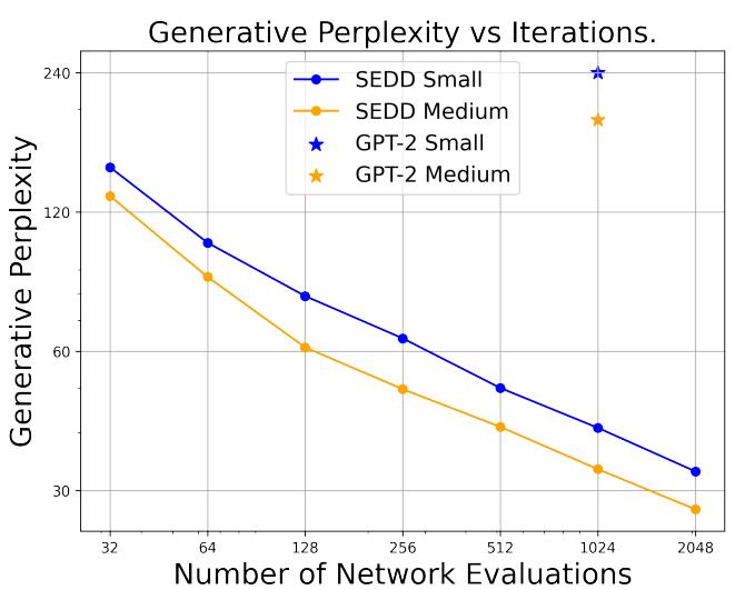 使用我们训练好的模型,我们在生成质量方面与先前工作进行比较。特别是,我们将 GPT‑2 与我们的 SEDD Absorb在多种规模下进行比较。SEDD Uniform 的结果见附录D。