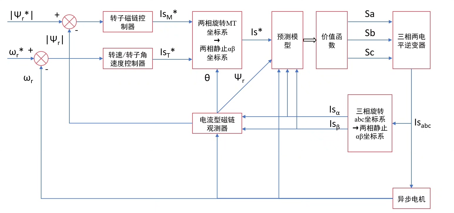 异步电机模型预测电流控制/MPCC simulink搭建的异步电机模型预测电流控制模型,磁链观测器为电流型,加入了一延迟补偿和预励磁 附带说明文档和相关参考文献,模型已经调好,可跑出图中效果,默认发送2023b版本的simulink模型 模型相关可