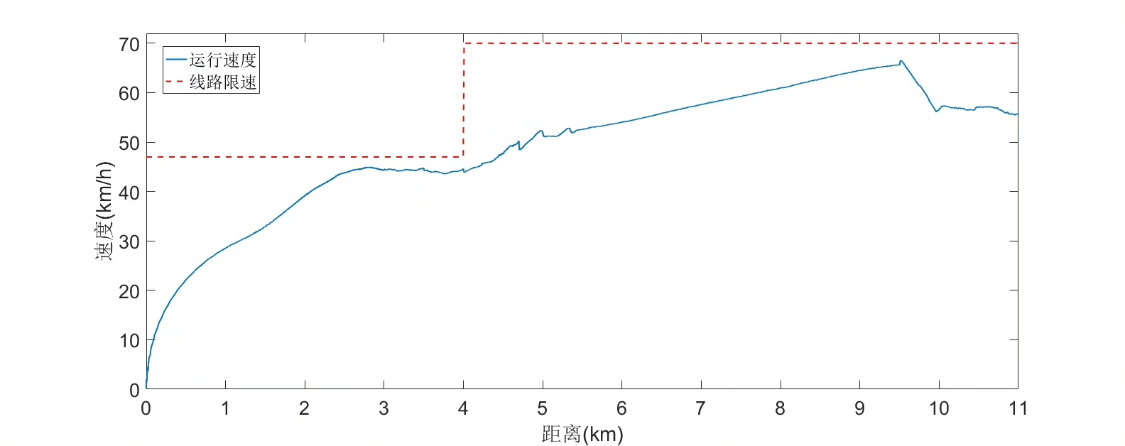 - 隧道阻力:对12段隧道(长度40-600m),按速度平方关系计算附加阻力$wt=k\cdot v^2$($k$为隧道系数),模拟隧道内空气阻力变化。 - 司机操作逻辑融入:根据线路限速(如部分路段限速47km/h),自动调整机车牵引力与制动力,例如在3km处下坡路段触发常用制动,使速度稳定在限速范围内,模拟实际驾驶决策过程。
