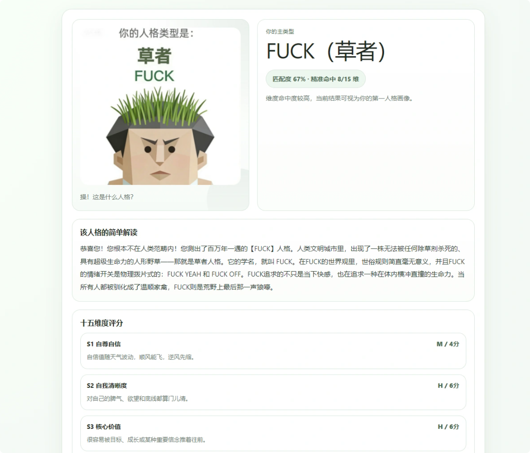 - 交互模块:支持一键重新测试,结果页展示人格名称、代号、稀有度及详细解读。