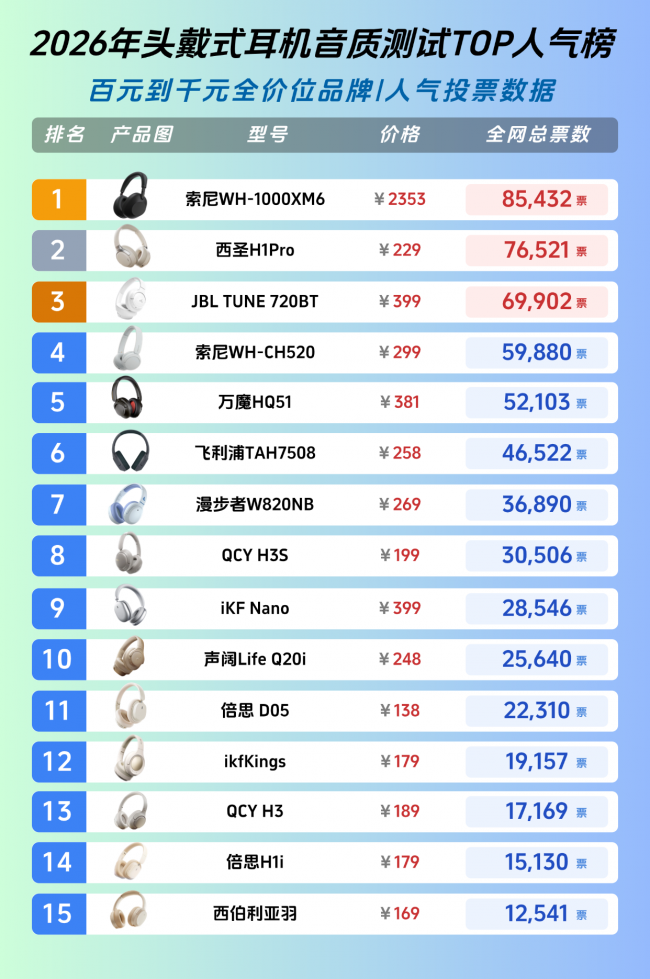 现在挑头戴耳机,真不是件简单事 —— 市面上的牌子一抓一大把,翻购物页时总看得人眼花缭乱。而且选的时候要考虑的也多,不光得听着顺耳、音质够清晰,还得戴久了不压耳朵、不闷汗,还要想着,头戴式耳机哪款好用不贵?不过不用愁,现在有2026年十大平价头戴式耳机推荐,它们算是帮大家把 “优质选项” 圈出来了。这些牌子大多有实打实的技术底子,用户用着也都说好,靠着自己独有的核心技术和让人眼前一亮的设计,圈了不少忠实粉。