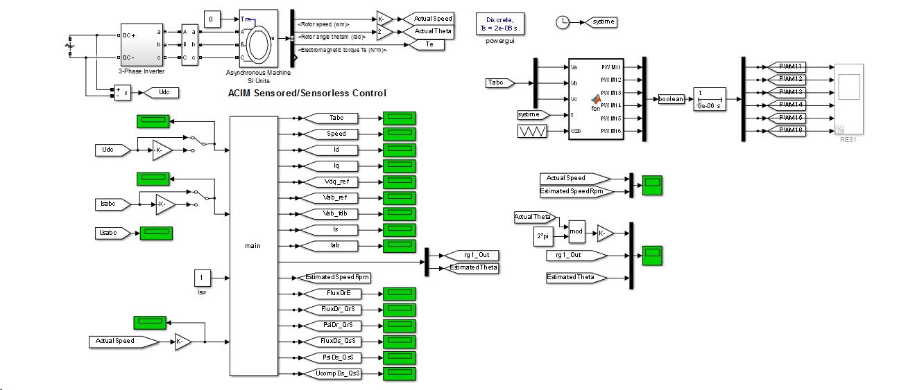 - 磁链与转速估算:基于采样电压、电流与开关信号,通过ACIFE模块观测转子磁链,再通过ACISE模块估算电机转速,为无传感器控制提供反馈。
