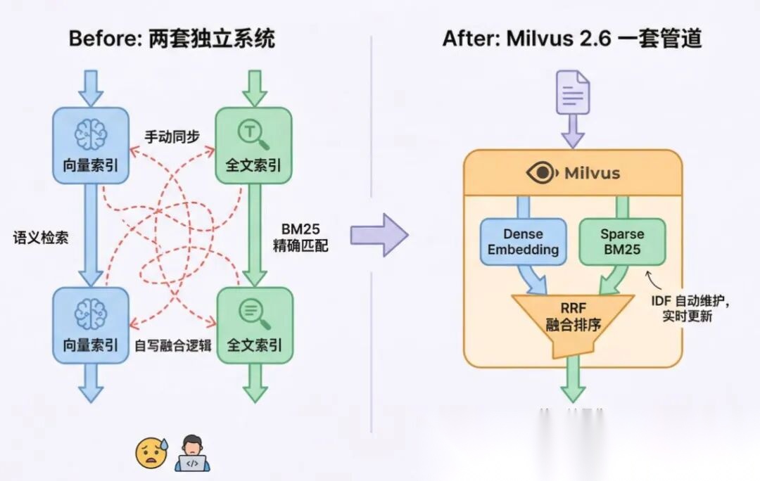 而 Milvus 2.6 的 Sparse-BM25 功能,彻底解决了这个问题——它把两套检索管道合成了一套,实现了一次查询,同时覆盖语义和精确匹配。
